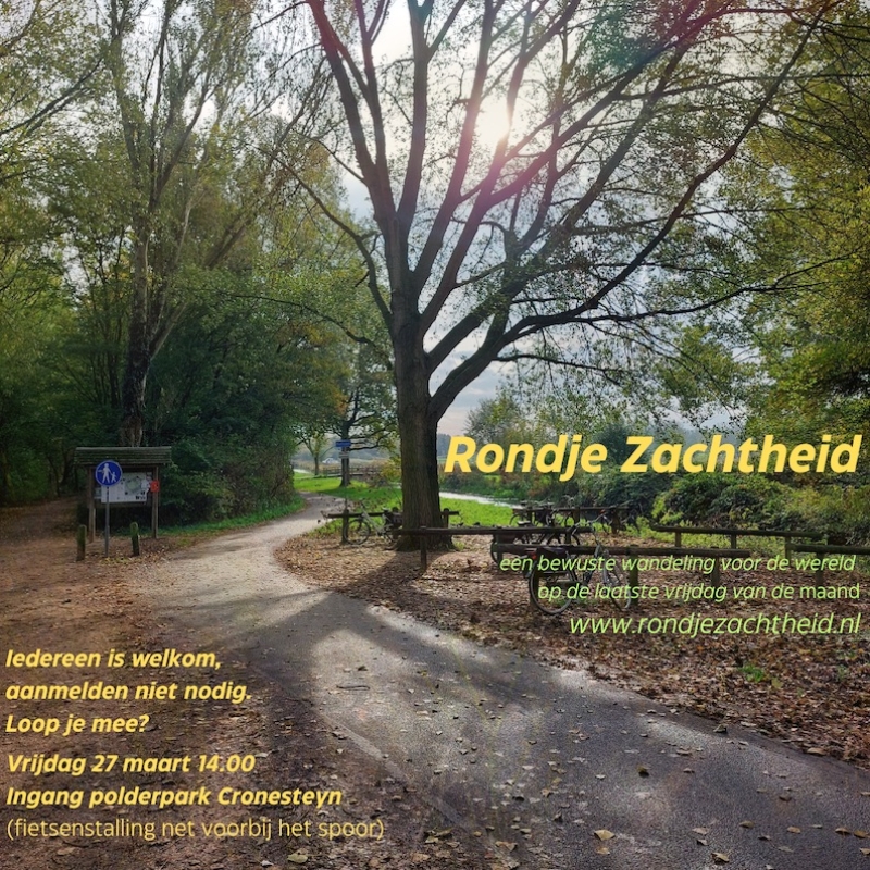 Elke laatste vrijdag van de maand lopen mensen in 32 verschillende plaatsen bewust vriendelijk een Rondje Zachtheid voor de wereld. Een zachtmoedige wandeling met zachtaardige mensen vanuit doorvoelde noodzaak.