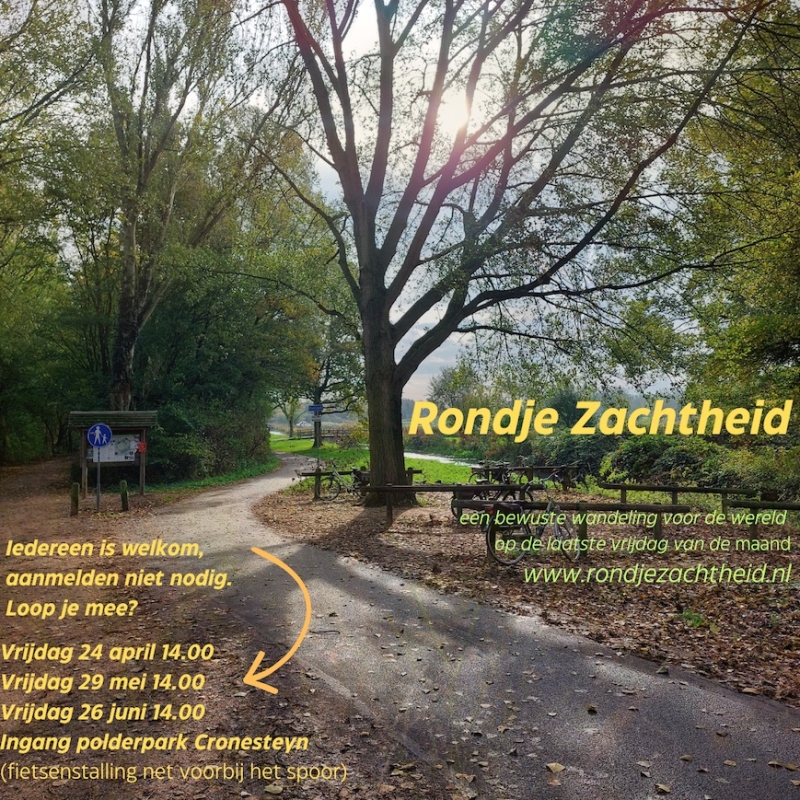 Ook deze maand lopen we weer een lente-rondje Zachtheid op de laatste vrijdag: 24 april om 14.00. Met een gedichtje als opening en afsluiting en voor de liefhebber een kop thee na afloop. Tussendoor kletsen of zwijgen. Beide prima.